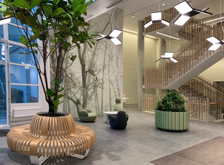 Planlösning: Från entrén på plan 6 kommer man in i den stora öppna zonen med ca 7 meters takhöjd. Här integreras den del av lokalen som ligger på plan 7, alltså en lokal i två plan som är sammanbyggd via flera interntrappor. Detta kompletteras med en blandning av öppna kontorslandskap och av flexplatser. Mötesrum och webrum finns spridda runt om i lokalen. Närmast den stora fönsterväggen ligger paus/pentryzonen.